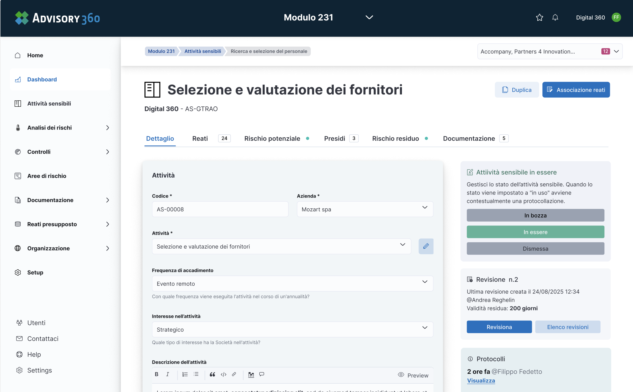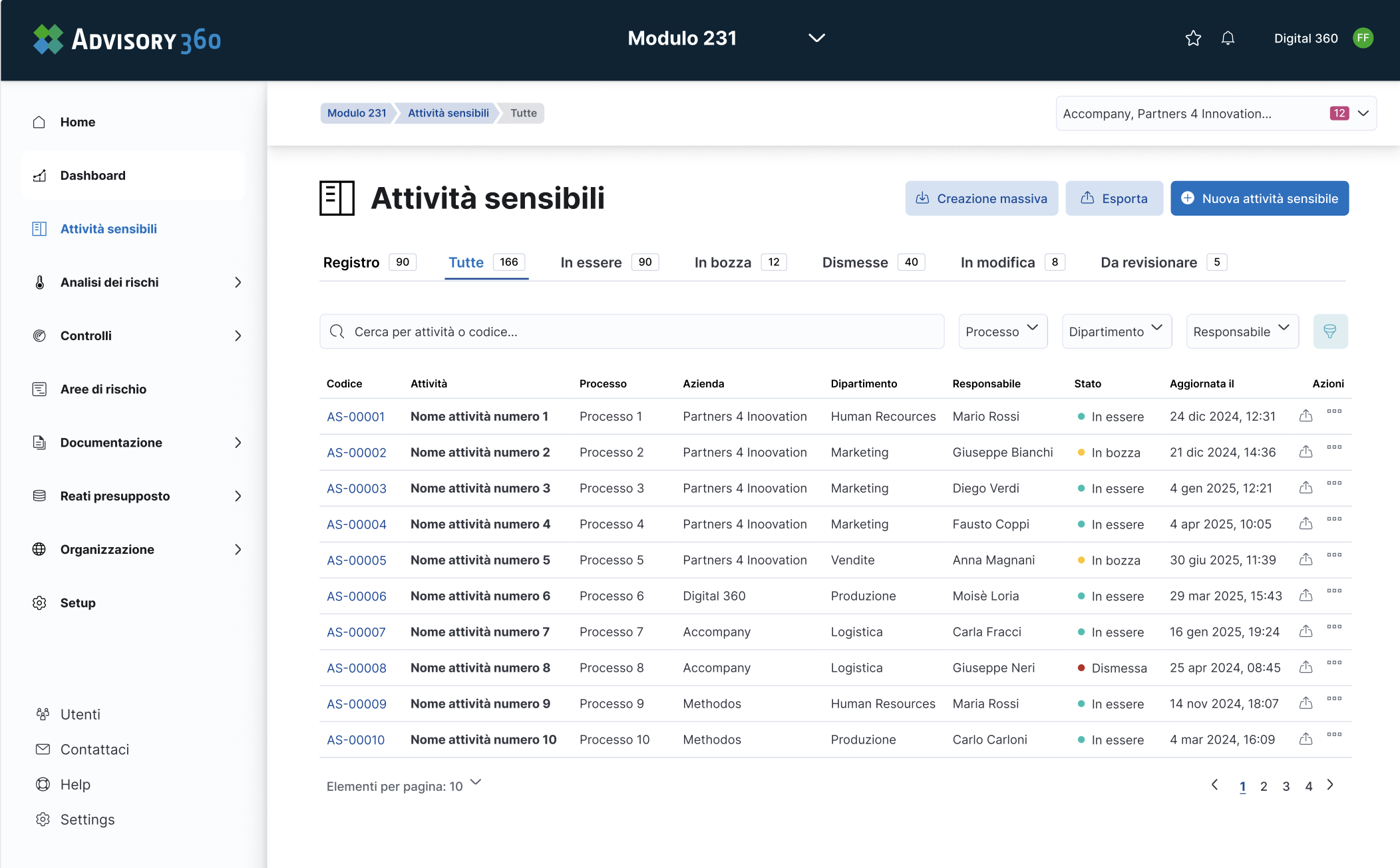 Potrai gestire il Registro delle attività sensibili, mappando i processi aziendali esposti ai rischi-reato previsti dal D.Lgs. 231/2001