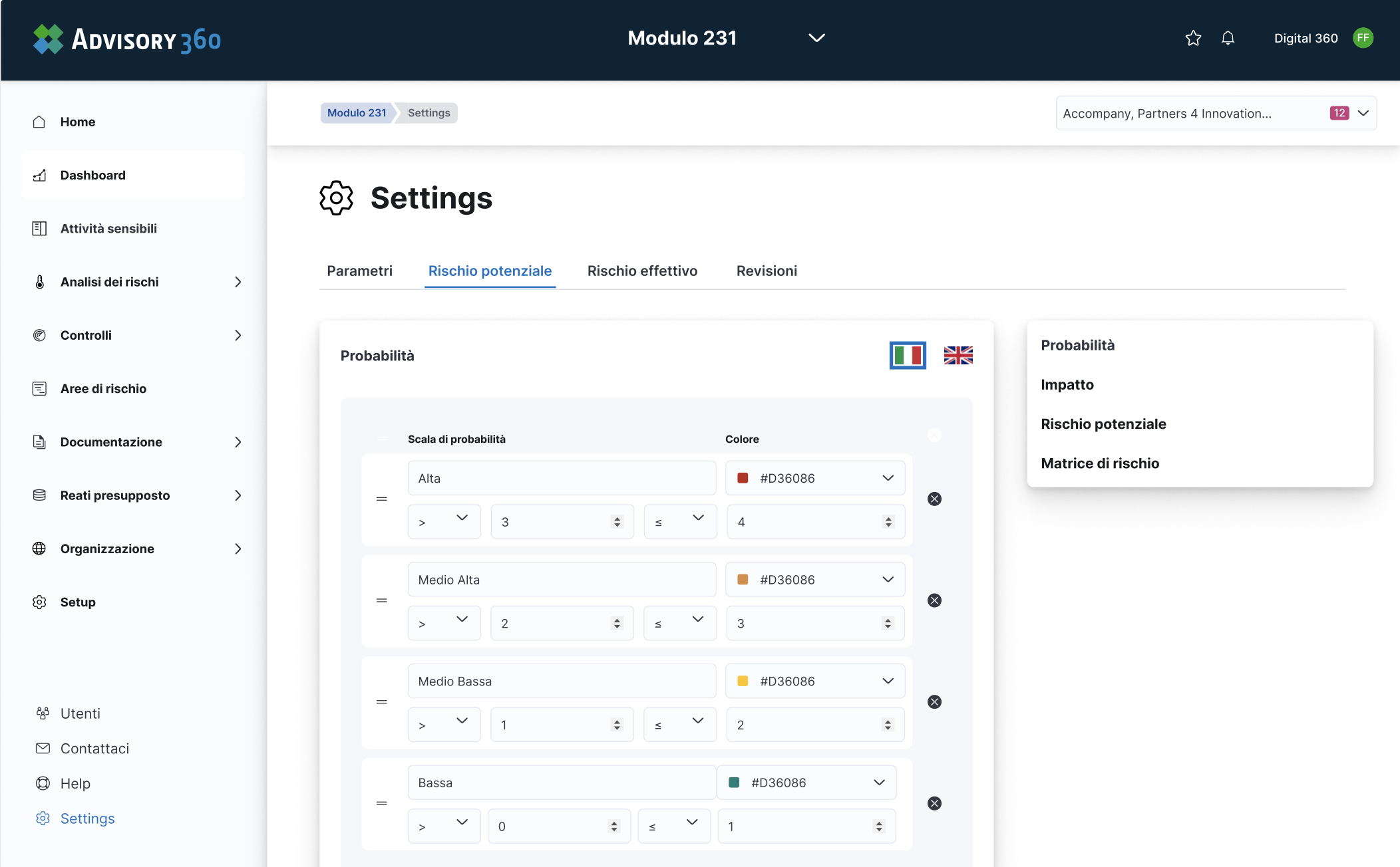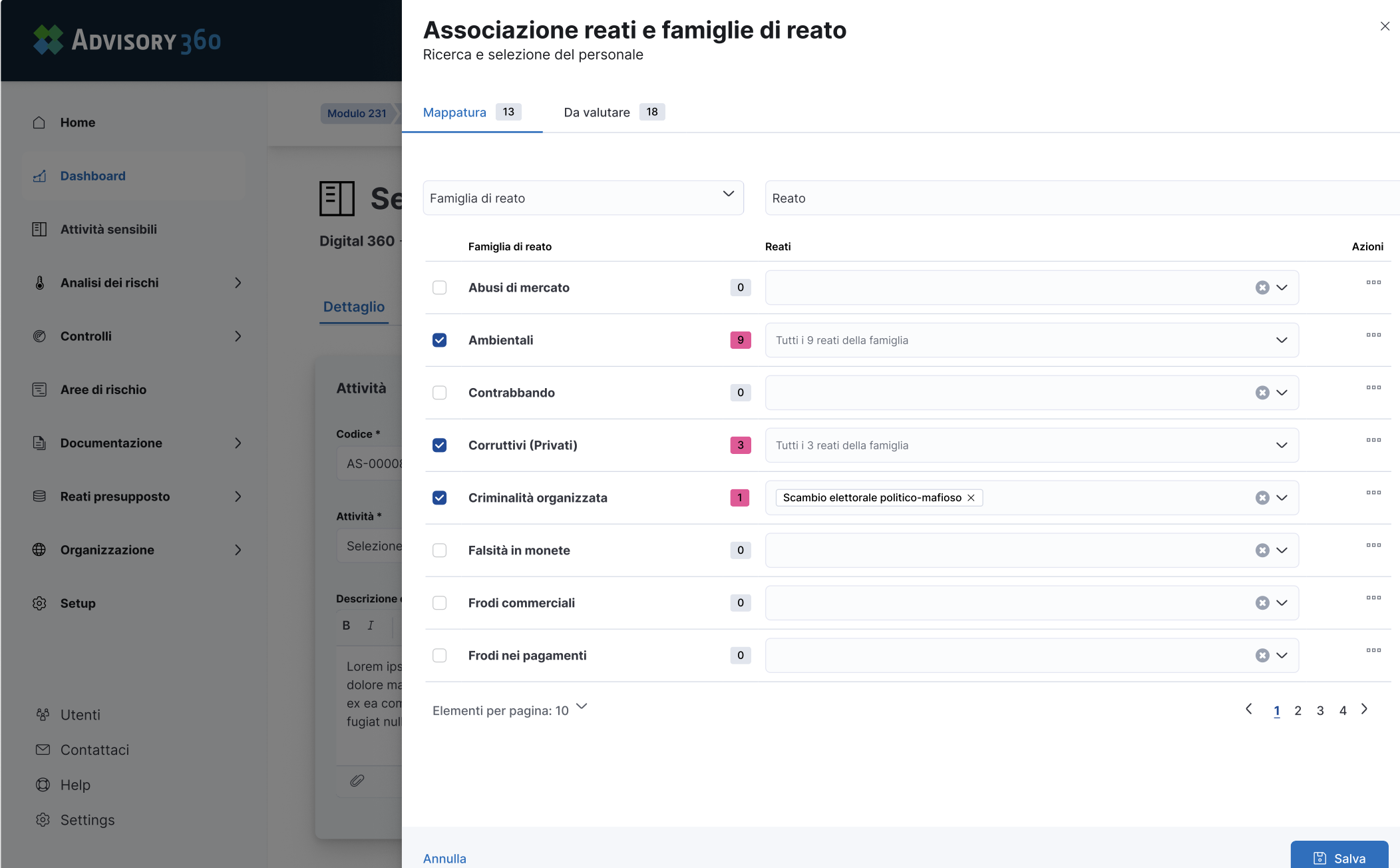 Potrai configurare le aree di rischio da monitorare, sulla base dei reati applicabili e/o delle attività in perimetro alla propria organizzazione
